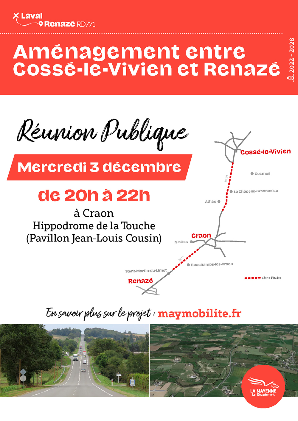 Dans le cadre de l’aménagement de la RD771 entre Cossé-le-Vivien et Renazé, le Conseil départemental de la Mayenne continue sa démarche de concertation auprès de tous les acteurs du territoire en organisant une réunion publique le mercredi 3 décembre de 20h à 22h à l'hippodrome de Craon (pavillon Jean-Louis Cousin).