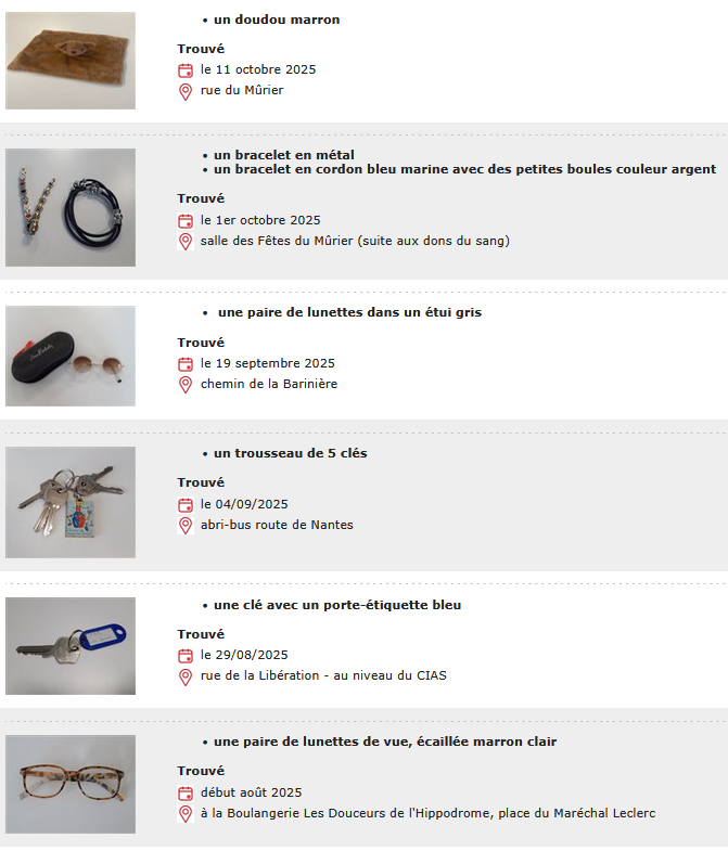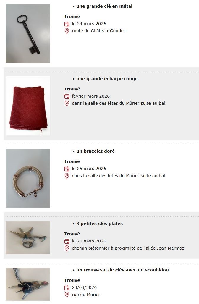 La Mairie recueille régulièrement des objets perdus sur la commune (salles de sports, salles de réunion, voie publique...), retrouvés par les services municipaux ou par des particuliers : clés, vêtements, portables... nombre d’entre eux attendent toujours leur propriétaire. Ayez le réflexe de consulter la liste ci-dessous et/ou de contacter l’accueil de l’hôtel de ville (02 43 06 13 09 ou etatcivil@ville-craon53.fr).