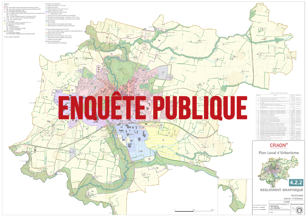 Par arrêté n°2025-217 du 21 août 2025, le Maire de Craon a prescrit l’ouverture et l’organisation d’une enquête publique portant sur le projet de plan local d’urbanisme (PLU) révisé, l’élaboration du plan de valorisation de l’architecture et du patrimoine (PVAP) et le projet de périmètre délimité des abords (PDA) des monuments historiques de la commune de Craon. L’enquête publique se déroulera en mairie du lundi 29 septembre 2025 à 9h00 au jeudi 30 octobre 2025 à 12h00.