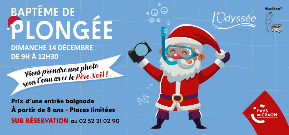 Préparez-vous pour une expérience unique en cette période de fêtes ! Le dimanche 14 décembre, de 9h à 12h30, le centre aquatique l'Odyssée propose, en partenariat avec le club de plongée HippoCraon’P une activité exceptionnelle : un baptême de plongée, et en bonus, une photo avec le Père Noël. L’occasion parfaite pour immortaliser ce moment.