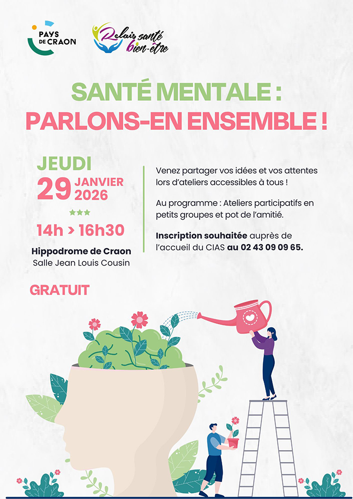 Dans le cadre du Contrat Local de Santé (CLS), la Communauté de Communes du Pays de Craon organise un temps participatif dédié à la santé mentale, le jeudi 29 janvier 2026 à partir de 14h, à l’hippodrome de Craon – salle Jean‑Louis Cousin.